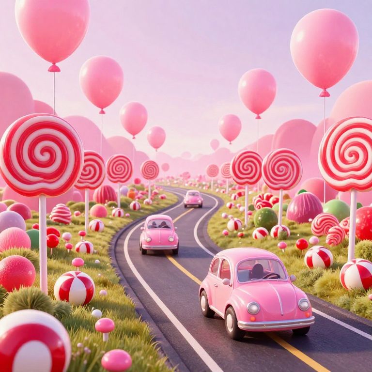 A whimsical 3D-rendered fantasy landscape features a candy-themed highway lined with towering lollipop trees and oversized peppermint candies, where gumdrop-shaped cars glide along a licorice road under the soft glow of pink balloons, evoking a surreal, high-definition confectionery world.