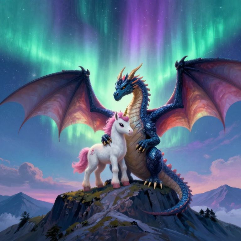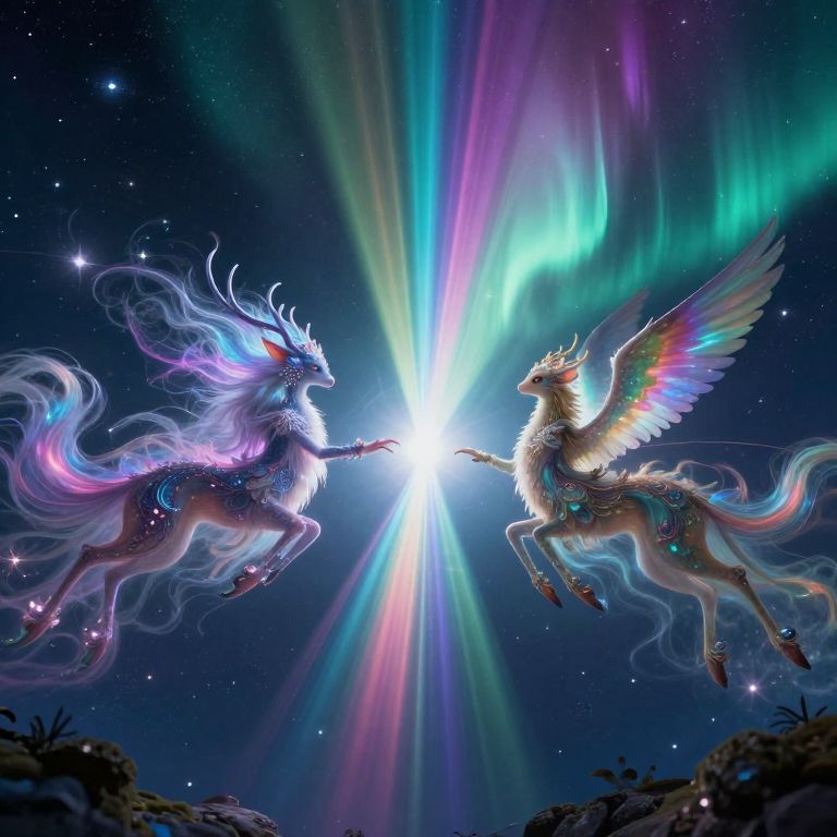 In an otherworldly style evocative of celestial dreamscapes, envision a panoramic view of two universes converging in a spectacular cosmic encounter. From an elevated vantage point, witness the mesmerizing spectacle as fantastical creatures from each realm are pulled together by ethereal forces, their intricate designs and flowing garments illuminated by prismatic beams piercing through the night sky. This surreal convergence reveals a harmonious blend of fantastical beings, united under a radiant aurora borealis backdrop that defies conventional physics, sparking a sense of wonder and existential connection in an environment that ignites the imagination.