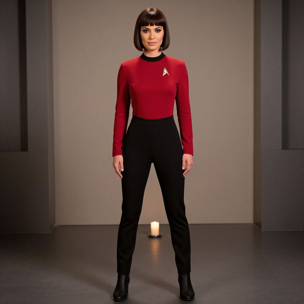 Photograph of a woman with a short black bob, wearing a red Starfleet turtleneck and black pants, standing in front of a gray backdrop