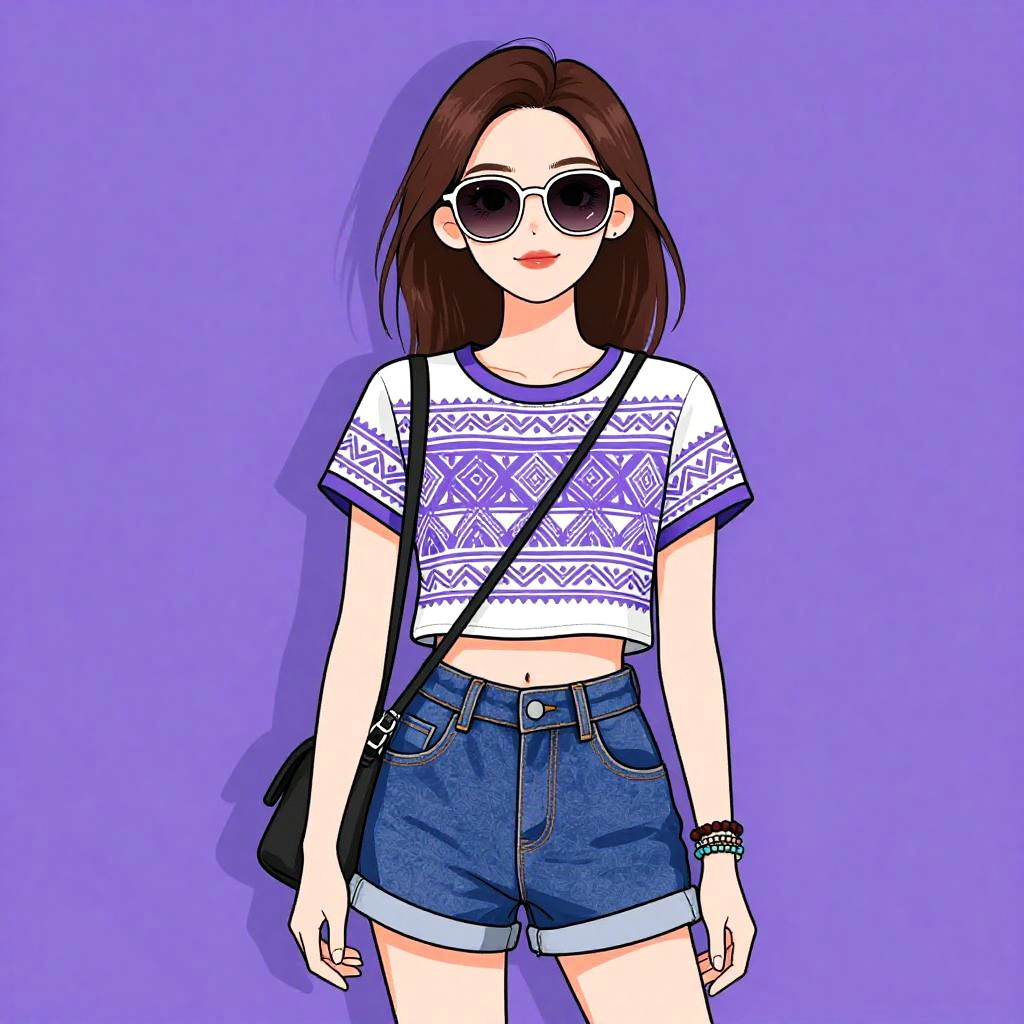Woman with pretty face and pretty hair. Woman, casual, sleeveless denim shirt with collar, buttoned front, faded wash, tucked into a high-waisted, A-line, suede skirt in burnt orange, front button closure, above-knee length, oversized round sunglasses. --sref 1467