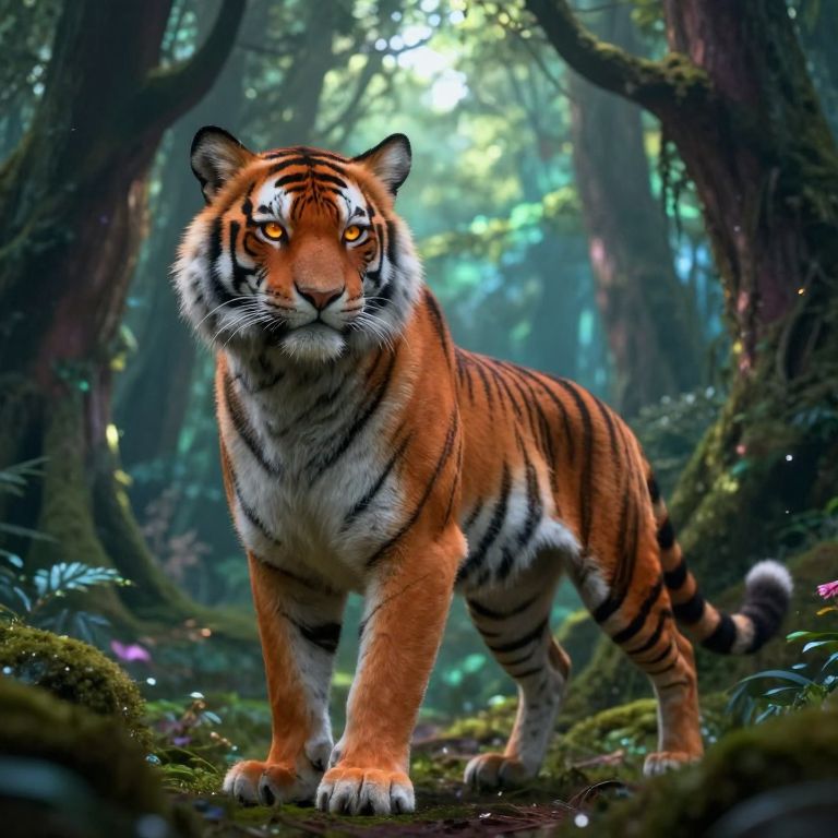 Kemonomsu, mystical anthropomorphic creature with fur blending tiger and fox patterns, glowing amber eyes, standing in a dense enchanted forest with ethereal light filtering through ancient trees, fantasy style, detailed fur texture, vibrant colors, dynamic pose
