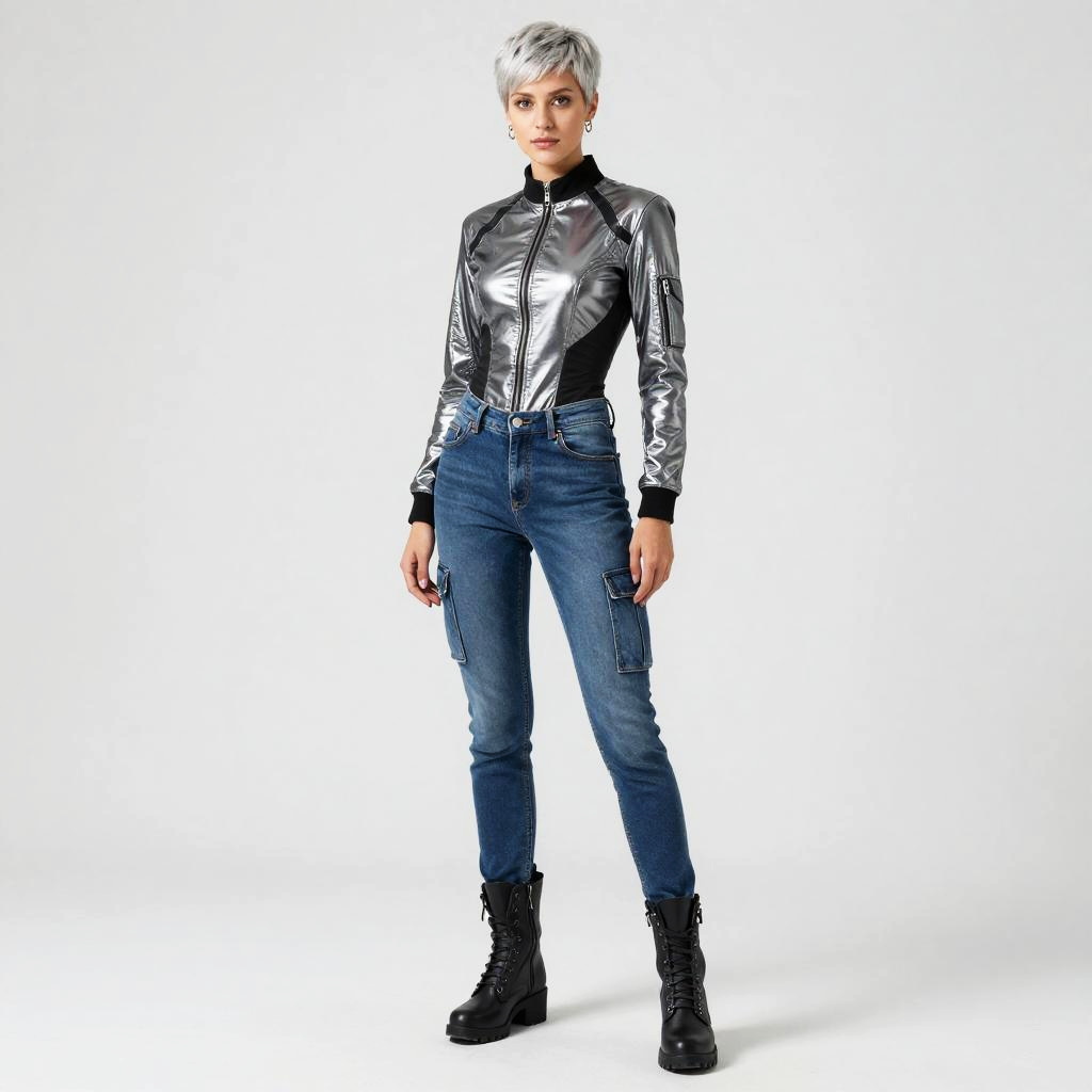 Photograph of a young woman with short, silver hair standing against a white background. She wears a shiny, silver, long-sleeved blouse with black cuffs and a black collar, paired with high-waisted, blue denim jeans featuring multiple pockets. Her black, lace-up ankle boots add a rugged touch. She stands with a confident posture, hands by her sides. The high contrast and clean background draw attention to her modern, edgy outfit and stylish appearance. The overall look is sharp and contemporary, with a futuristic vibe.