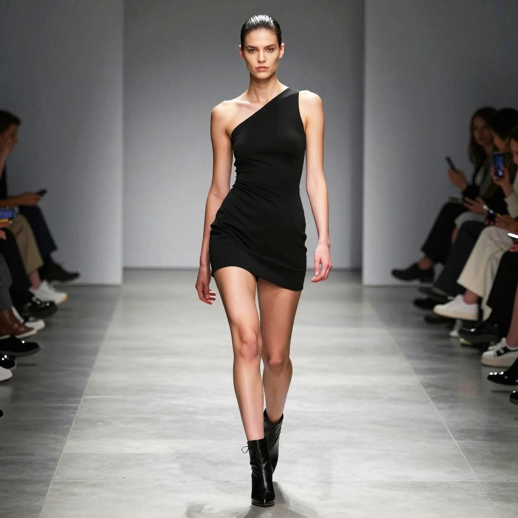 Mini curvaceous model posing elegantly on a minimalistic runway, sleek modern fashion, monochrome color scheme, high contrast shadows, avant-garde style, refined details