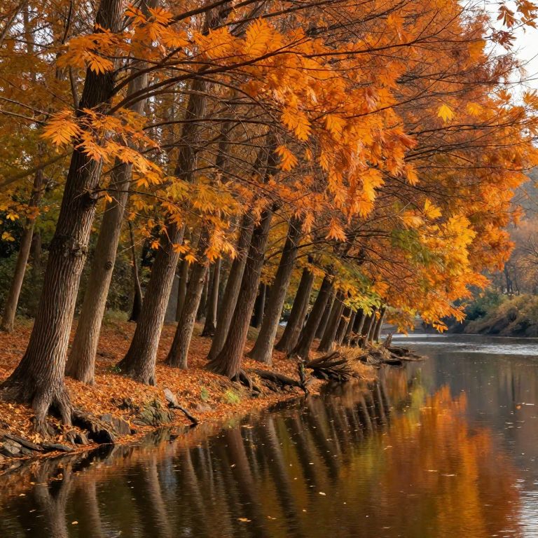 Photograph of a serene autumn scene featuring a row of tall trees with vibrant orange and yellow leaves lining a reflective river. The trees, with textured brown bark, stand on a forested bank covered in fallen leaves. The river, calm and dark, mirrors the colorful foliage. The background shows a gentle curve in the river, with hints of more forest and additional trees. The lighting is natural, highlighting the rich autumn colors and creating a peaceful, picturesque atmosphere.