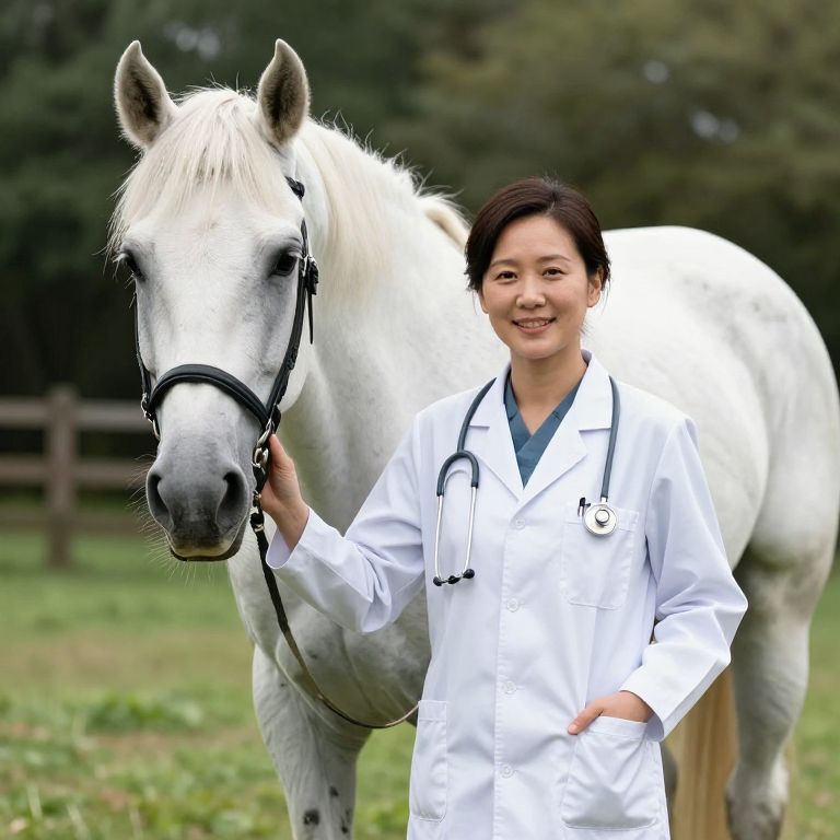 Photograph of an Asian woman with short black hair, smiling, wearing a white lab coat with a stethoscope around her neck, standing beside a white horse with a black bridle. The horse is positioned slightly to the left, with its head turned towards the camera. The background features a blurred, green grassy field and trees, with a wooden fence visible on the left. The woman's right hand rests on the horse's bridle. The image has a bright, natural light, emphasizing the white coat and horse's coat. The overall atmosphere is professional and friendly.