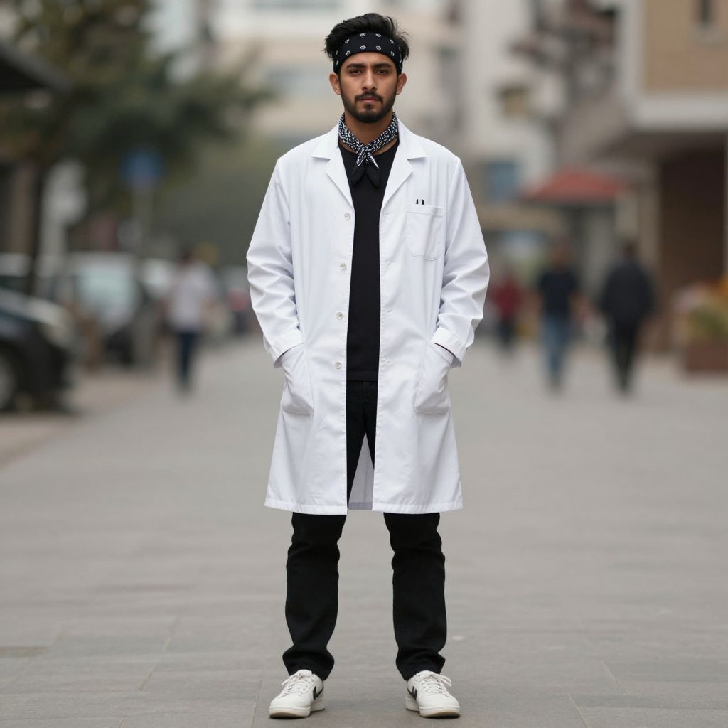 Photograph of a bearded man in a white lab coat, black pants, white sneakers, and bandana, standing on a blurred urban street.