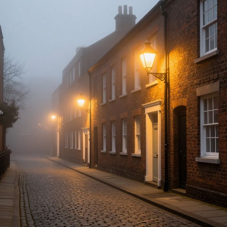 Foggy cobblestone streets wind between brick buildings, illuminated by warm street lamps casting golden glows that dance against the misty air, creating a serene and timeless atmosphere where history whispers through every corner.