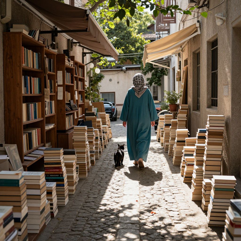 Books stacked high line the cobblestone path of a quaint alley, flanked by wooden shelves and awnings, as a woman in a teal robe and headscarf walks alongside a black cat, casting long shadows beneath the dappled sunlight filtering through overhead branches.