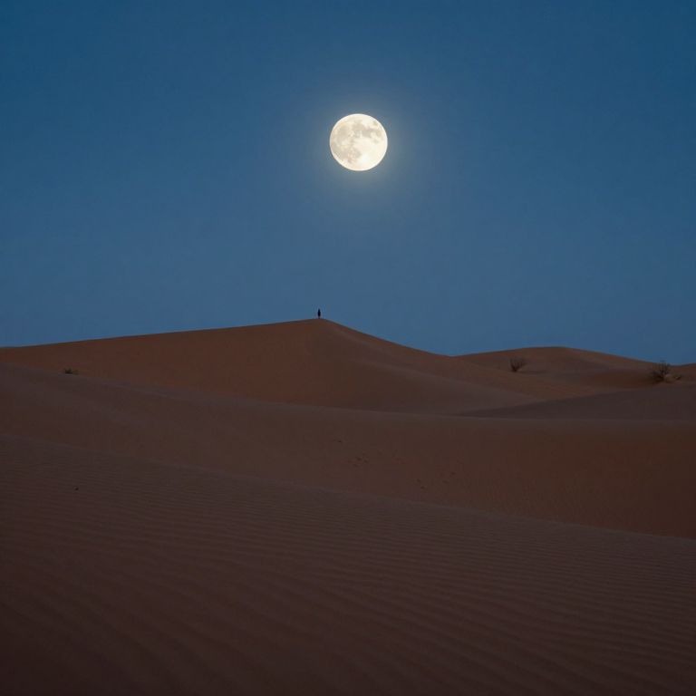 Photograph of a desert night scene under a clear, deep blue sky. A bright, full moon dominates the upper center, casting a soft glow. The foreground features undulating, dark reddish-brown sand dunes with subtle ripples. A small, solitary figure stands atop the highest dune, silhouetted against the moonlight. The background is minimal, emphasizing the vastness of the desert and the moon's illumination. The overall composition is calm and serene, highlighting the stark contrast between the moonlit sky and the dark dunes.