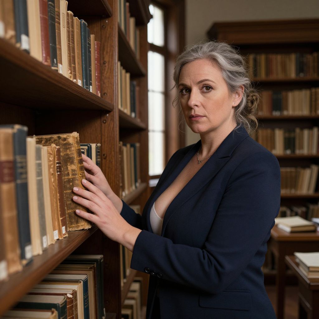 A serious and thoughtful library archivist woman in her 40s with kind brown eyes, fine grey hair tied in a loose bun, and a plain navy blazer, standing in a dimly lit, old-world library with towering shelves filled with dusty, leather-bound books. The sunlight filters through tall windows, casting soft amber shadows, and the air carries the scent of aged paper and ink. She gently reaches into a wooden bookcase to pull out a well-worn, yellowed volume, highlighting the dusty charm of the old books around her.. The woman has big tits and cute face