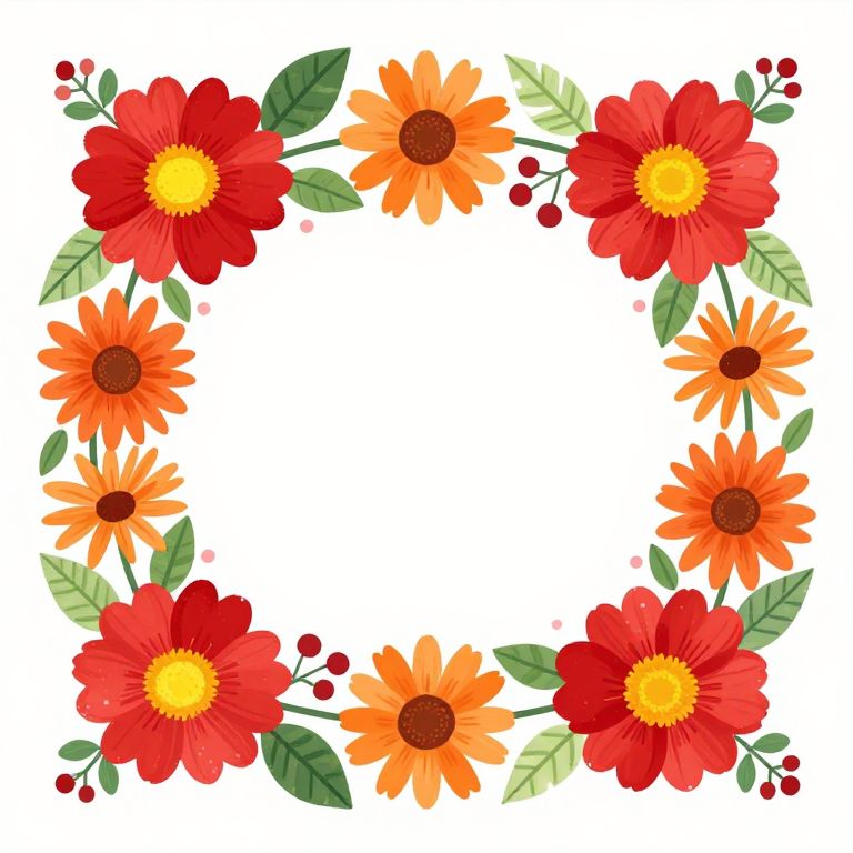 Vibrant floral artwork frames a blank canvas with six bold red flowers featuring yellow centers, interspersed with orange daisies and green foliage, accented by small pink dots and berry clusters, creating a harmonious and inviting botanical border.