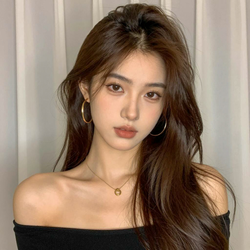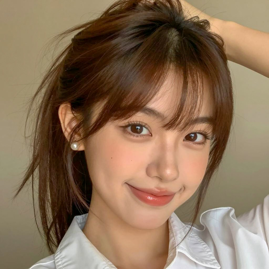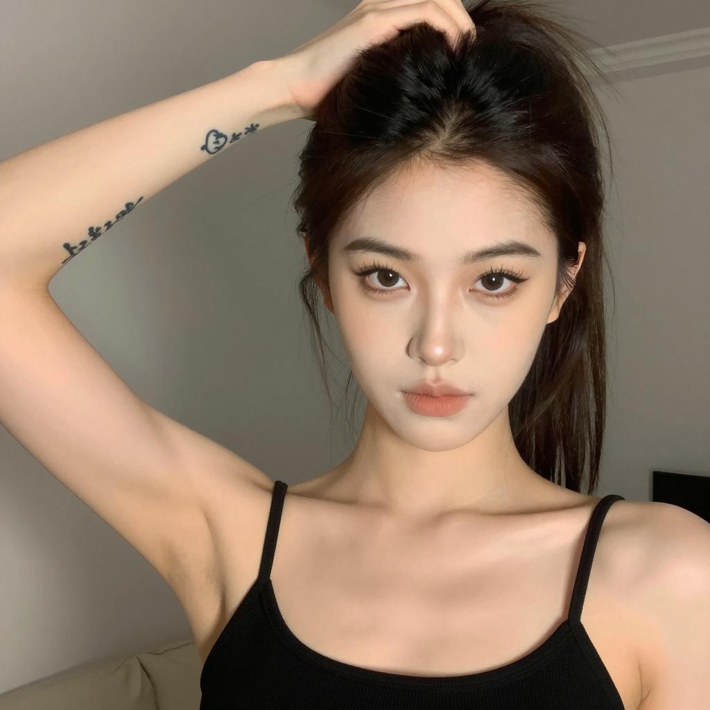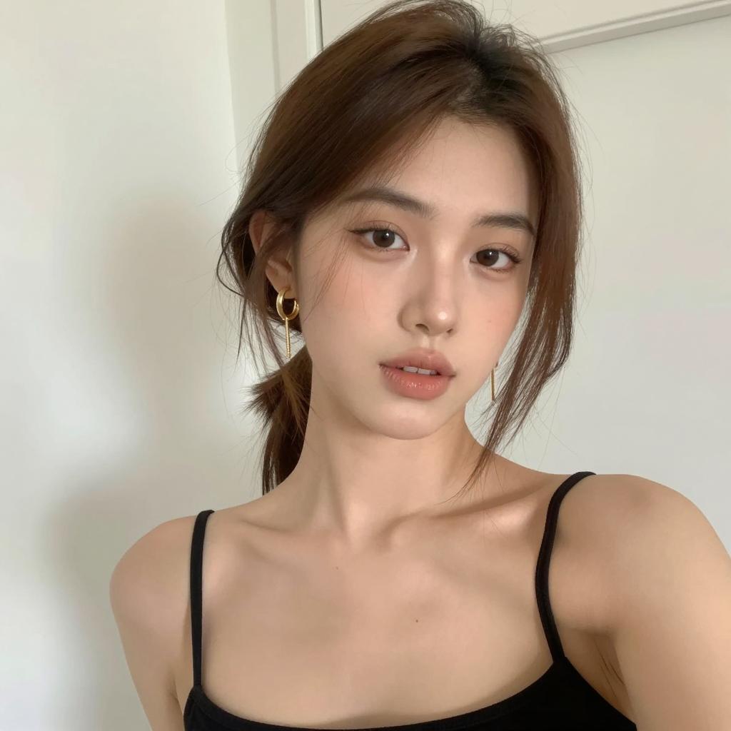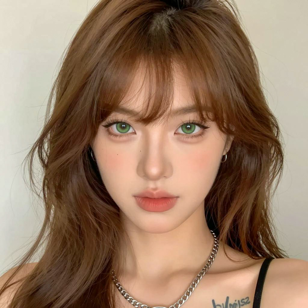 Photograph of a young woman with straight, dark brown hair and bangs, wearing a black sleeveless top. She sits in a car, looking at the camera with a slightly raised eyebrow and neutral expression. Car seat with black and white headrests in the background. She has light skin, green eyes, and pink lips. Upper body and face in the foreground, car interior in the background.