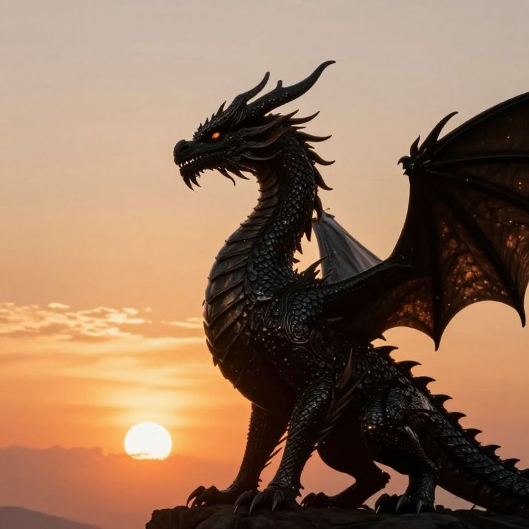 A majestic, computer-generated fantasy dragon stands silhouetted against a vibrant sunset, its intricate scales and flowing mane illuminated by the golden hour light, evoking a timeless, otherworldly presence as it gazes toward the horizon.
