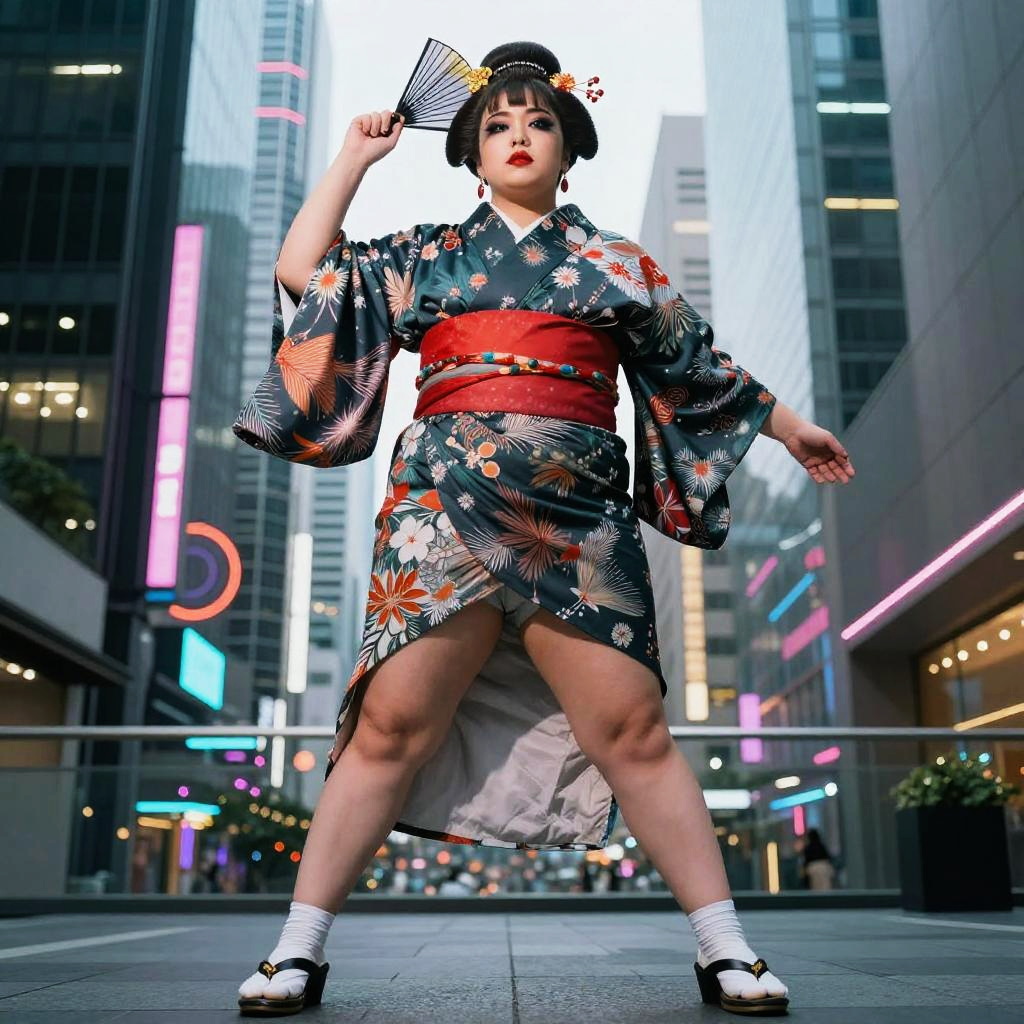 Plus size Japanese model in avant-garde fashion, futuristic cityscape backdrop with neon lights reflecting off sleek glass buildings, dramatic makeup and bold accessories, striking a powerful pose that blends traditional and contemporary Japanese aesthetics.