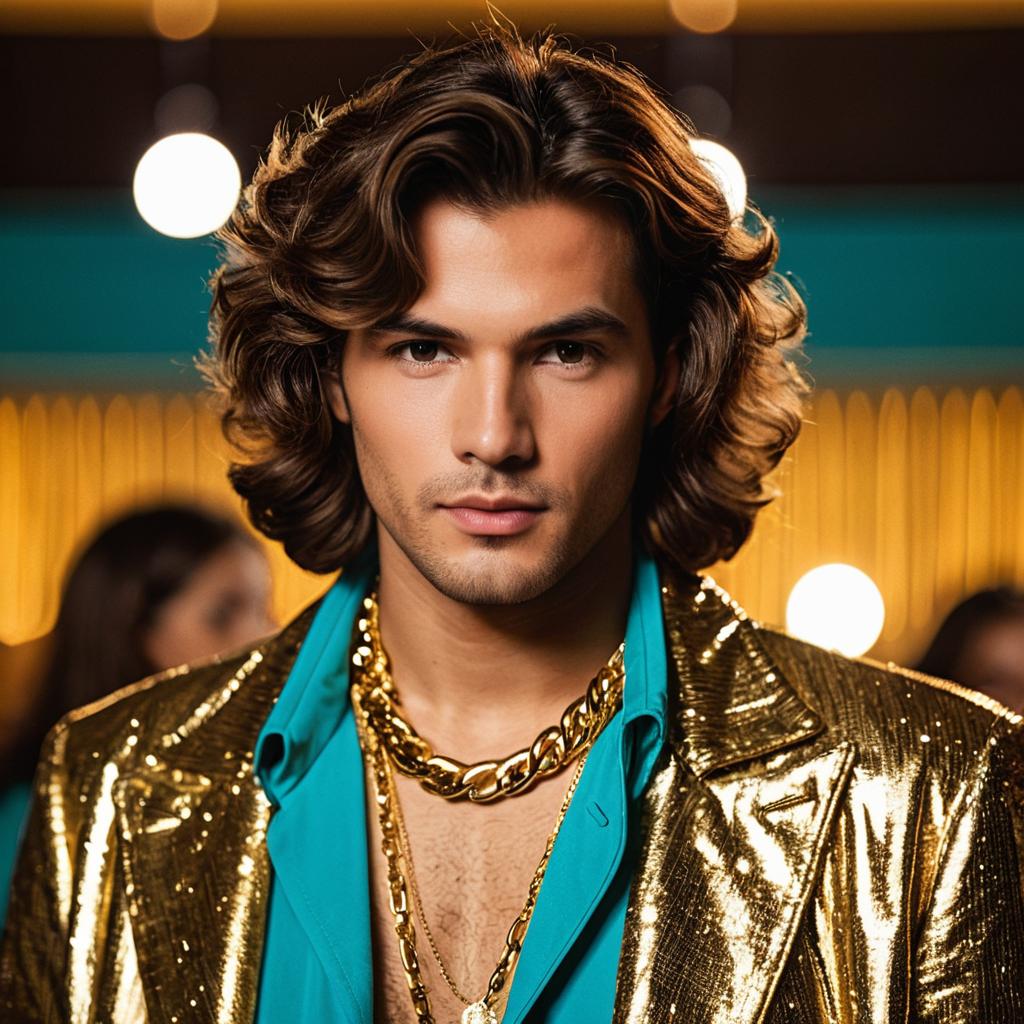 Photorealistic image of a male model wearing a shiny purple metallic disco outfit with blue lapels and a red collared shirt. The model has dark brown, styled hair and a serious expression, posing confidently with hands on hips. The background features vibrant colorful bokeh and studio lighting, capturing an 80s retro disco vibe.