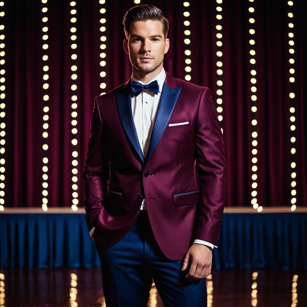Disco outfit male, photorealistic, male model, standing, looking at camera, shiny purple metallic suit, blue shirt, red collar, 80s style, dark brown hair, styled up, serious expression, hand on hip, colorful bokeh background, studio lighting, fashion photography, vibrant colors, glossy ure, medium shot, confident pose