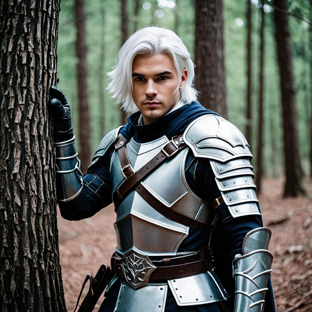 Portrait of a young man wearing intricate purple and gold medieval-style armor and a matching pendant necklace. He has vibrant purple hair and dark eyes, looking directly at the camera with a serious expression. The background is softly blurred, emphasizing the upper body and the detailed costume.