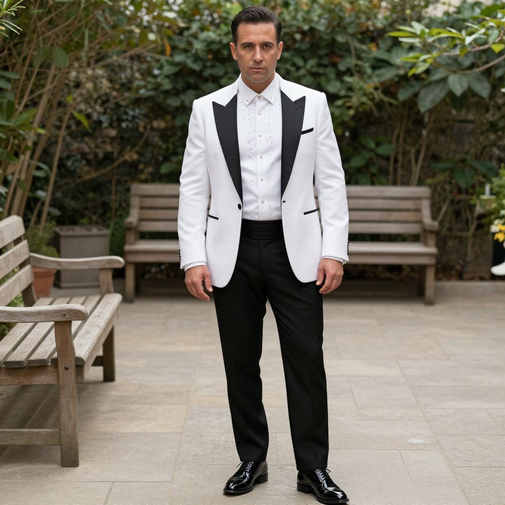 A man, classic white dinner jacket, black satin shawl lapels, white dress shirt with silver studs, black cummerbund, black dress trousers, shiny black leather oxfords, open-air courtyard, wooden benches, lush greenery, camera obscura style, confident expression. Man has masculine face and piercing eyes