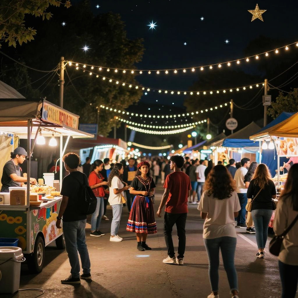 Realistic photo.A lively street festival with twinkling lights, food trucks, and performances showcasing local talents with lots of stars and lighting, Cheers to Community! realistic photo