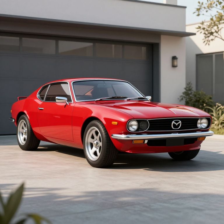 Shiny red Mazda MX-81 Aria Concept gleams under soft sunlight as it sits parked in front of a modern garage, showcasing its sleek design and classic charm.