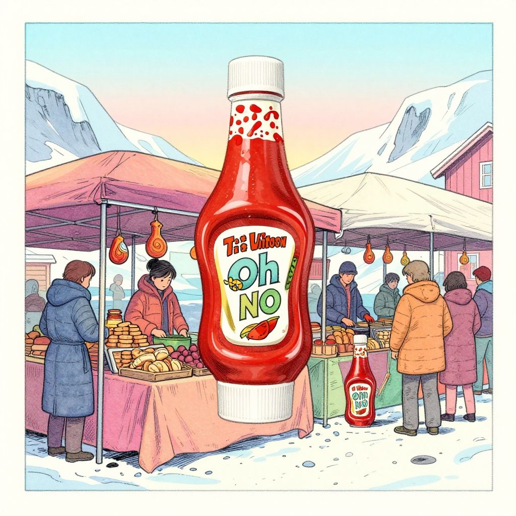 The outdoor market in the arctic doesn't have ketchup, cinematic, oh no, (colored inked, comics, graphic novel illustration, flat colors, colorful, pastel, highly detailed, large gradient, paper texture, go pro, color graded illustration, comics page):1.4, wcxl, outdoors