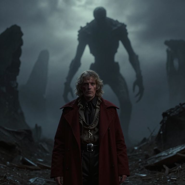 Focus Shot On The Style Inspired Clothing, dvd screenshot of a 1980s dark souls dark fantasy film, a giant tall skinny monster that is scary and is taller then mountains,