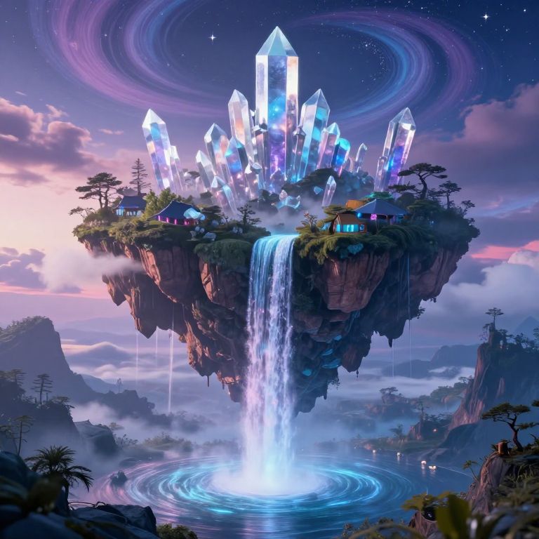 Digital fantasy artwork of a floating island with glowing crystal structures, waterfall, houses, and illuminated waters, set against a vibrant, starry sky.