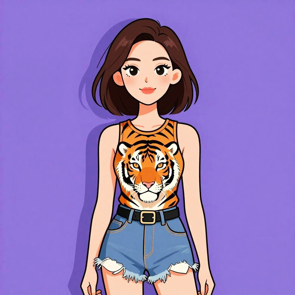 Digital illustration of a smiling young woman with medium-length black hair, wearing a patterned crop top, high-waisted brown skirt, large hoop earrings