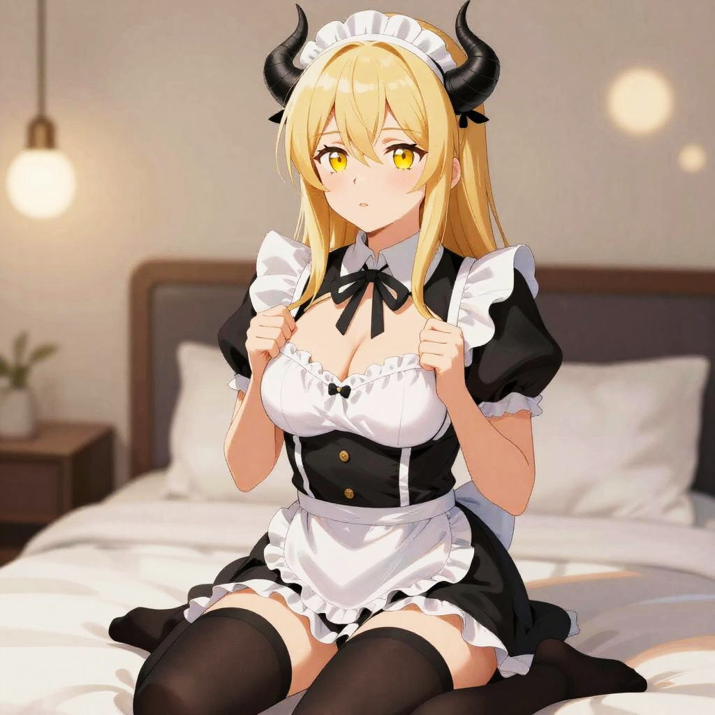 Digital anime-style drawing of a blonde woman with yellow eyes and black horns, wearing a black and white maid outfit with a revealing cleavage. She's sitting on a bed in a softly lit room, looking slightly to the side with a shy expression. Her outfit includes black thigh-high stockings and she's holding her ample breasts with both hands. Warm, glowing bokeh lights in the background.