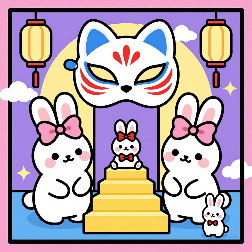 Digital illustration of a brightly colored, stylized scene. Centered is a white fox mask with blue eyes at the top. Below, a staircase with yellow steps leads down to a small white bunny with a red bow. Two larger white bunnies with pink bows stand on either side of the staircase. Surrounding objects include lanterns, clouds, and traditional Asian symbols. The background features purple, yellow, and pink hues with black borders. Bottom right has a small bunny with a red bow standing on a blue carpet. Artist in bottom right corner.