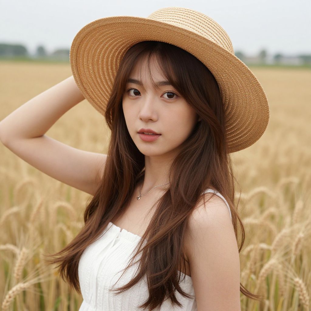 Young woman wearing a wide-brimmed straw hat stands gracefully in a golden wheat field, her long brown hair cascading over her shoulders as she gazes directly at the camera, adorned with a delicate necklace and a white sleeveless top.