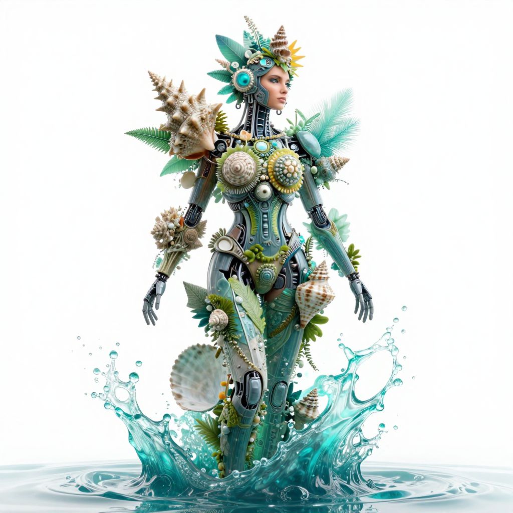 The image presents a striking, futuristic figure adorned with intricate details and vibrant colors. The central figure, a woman's form, is decorated with seashells and cybernetic elements, exuding a sense of advanced technology and nature intertwined. The figure is enveloped in a dynamic splash of teal and green hues, resembling water or liquid, which adds a sense of motion and fluidity to the composition. The background is a stark white, which contrasts sharply with the vivid colors and enhances the figure's prominence. The overall scene is a harmonious blend of organic and mechanical elements, creating a visually captivating and surreal atmosphere.