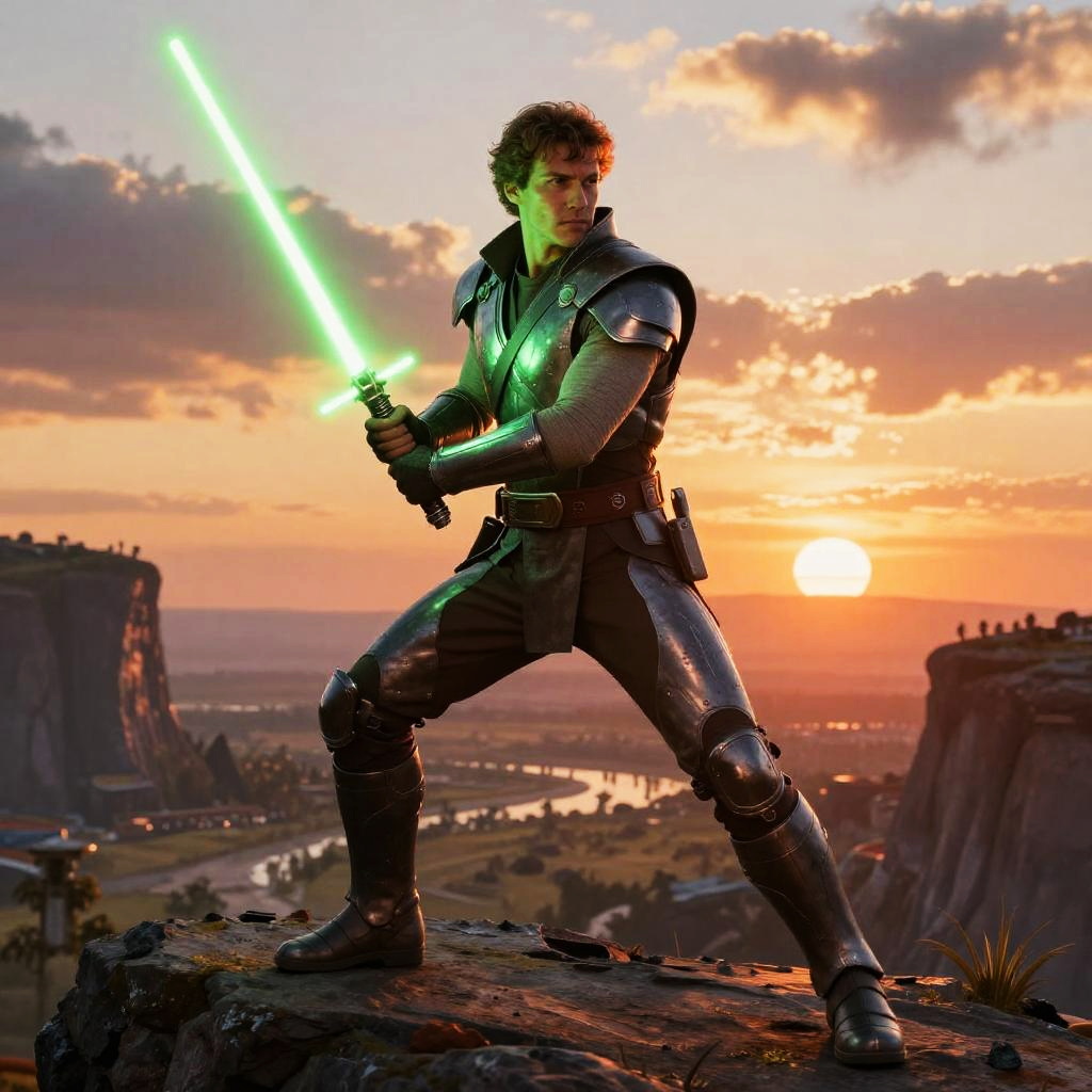 Human male Jedi art showing a determined figure in futuristic armor, holding a green lightsaber, poised on a rocky cliff overlooking a vast alien landscape at sunset, vibrant colors and dynamic composition with a focus on strength and wisdom.