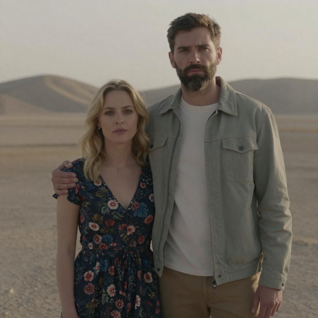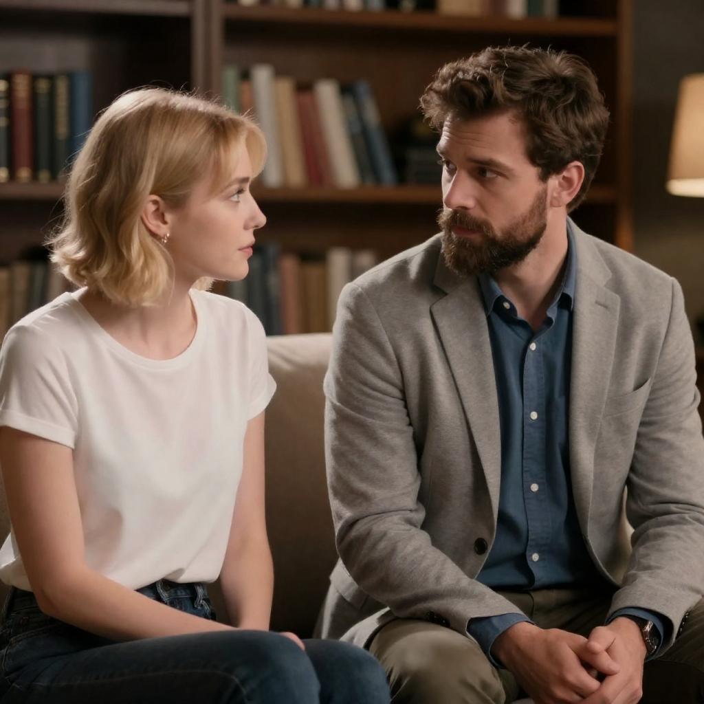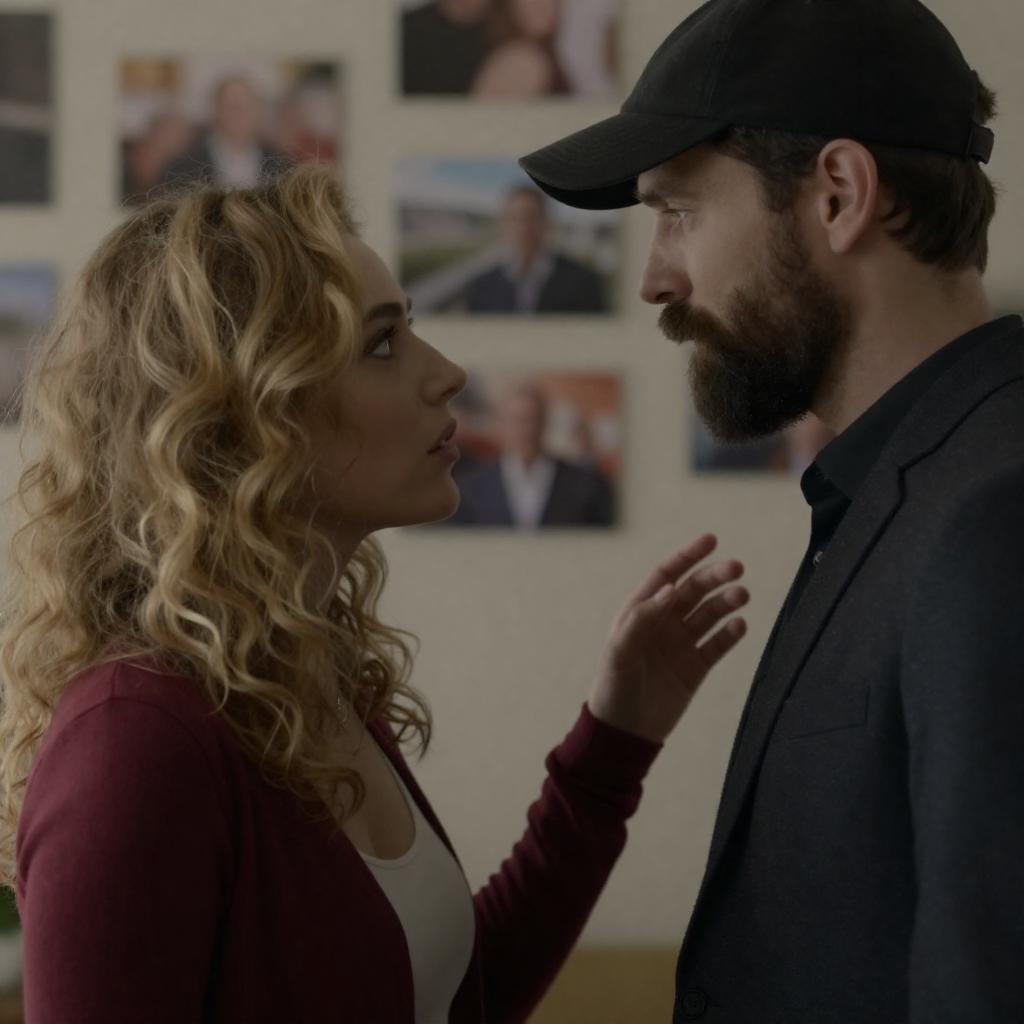 Photograph of a man and woman in a close, intense conversation inside a dimly lit vehicle. Woman has blonde hair, wears a dark jacket, looks to the right with surprise. Man has dark beard, wears black beanie, checkered scarf, brown jacket, looks at woman with focused expression. Vehicle window with vertical bars in background.