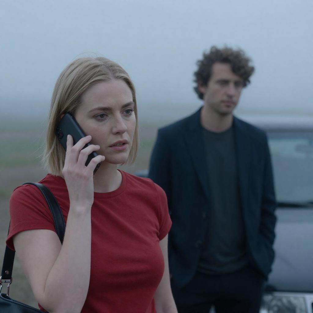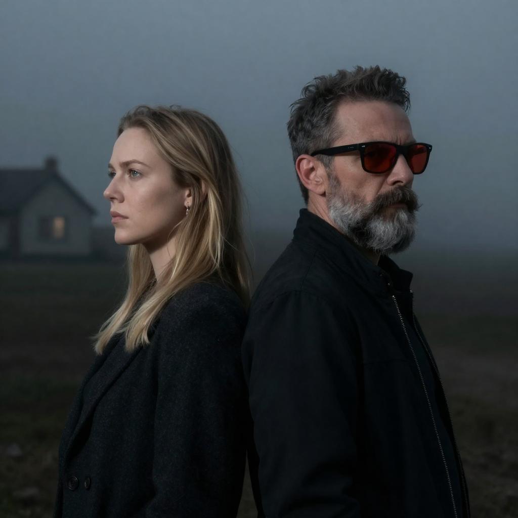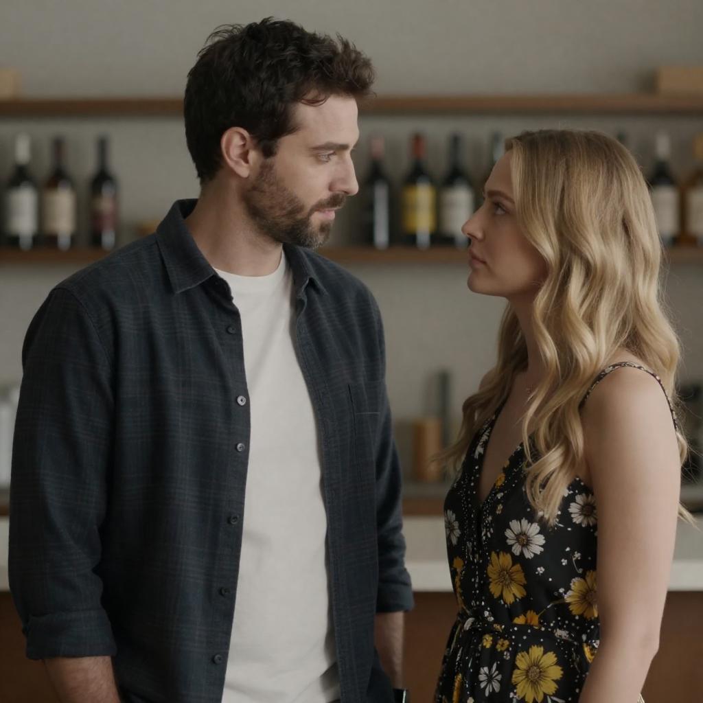 Photograph of a man and woman in a close, intense conversation inside a dimly lit vehicle. Woman has blonde hair, wears a dark jacket, looks to the right with surprise. Man has dark beard, wears black beanie, checkered scarf, brown jacket, looks at woman with focused expression. Vehicle window with vertical bars in background.