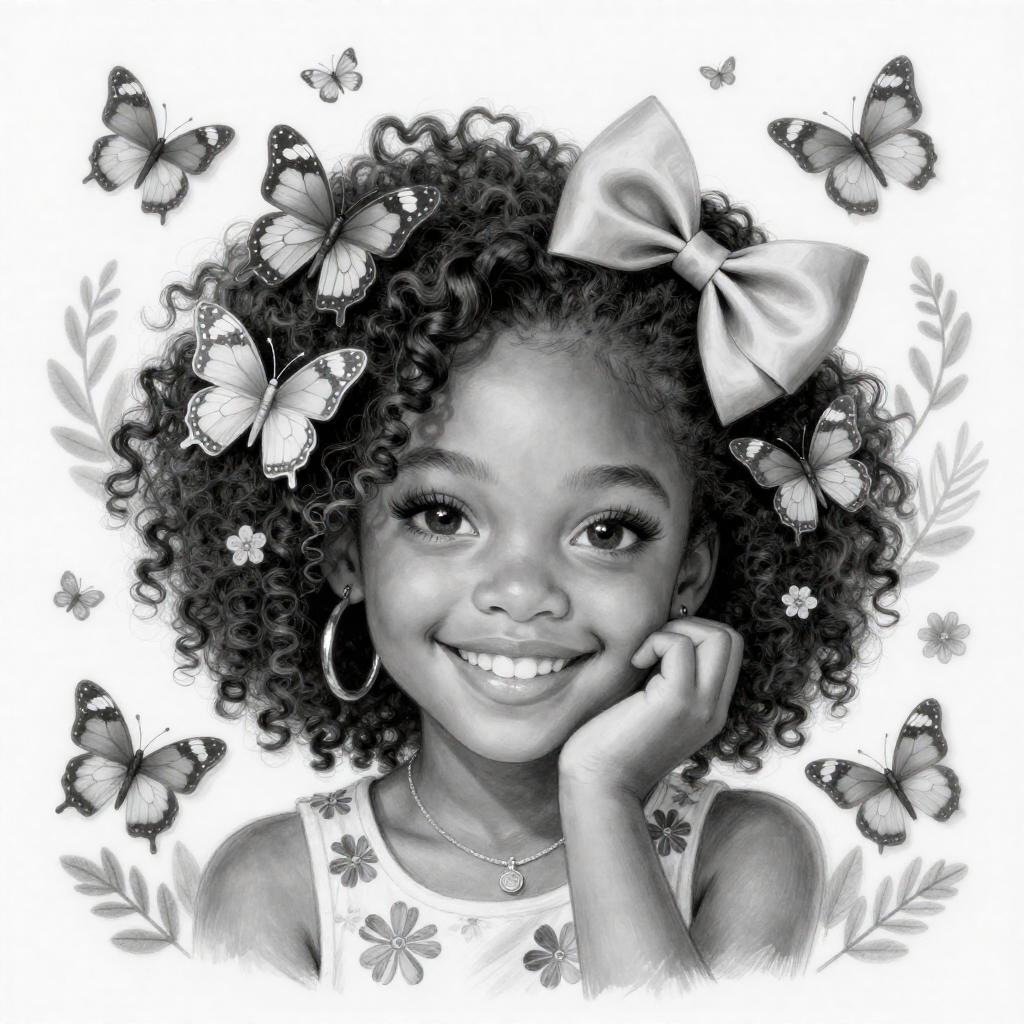 This is a detailed black-and-white digital drawing of a young Black girl with a radiant smile. She has large, expressive eyes, curly hair adorned with butterfly hair accessories and a large bow. Her head is tilted slightly, with one hand gently touching her cheek. She wears a delicate necklace and floral patterns are visible on her clothing. Butterflies and intricate floral designs surround her, adding a whimsical touch.