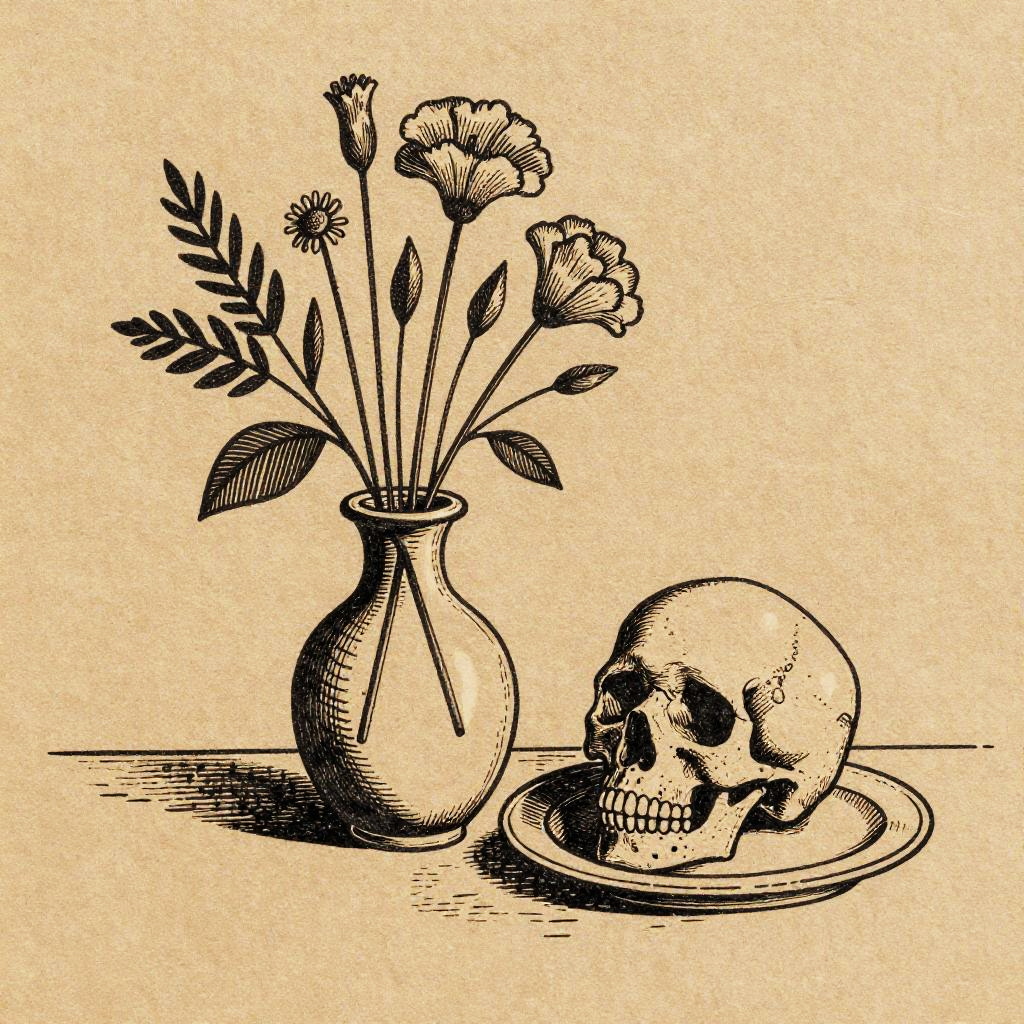 This is a black-and-white ink drawing on beige paper, featuring a still life composition. It includes a vase with tall flowers, a bulbous vase with leafy plants, and a plate with a detailed human skull. The flowers have simple, rounded petals, and the leafy plants have elongated leaves. The overall style is reminiscent of vintage woodcuts, with bold lines and intricate shading. The background is plain brown cardboard.