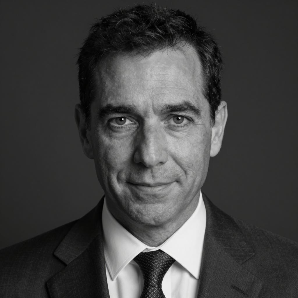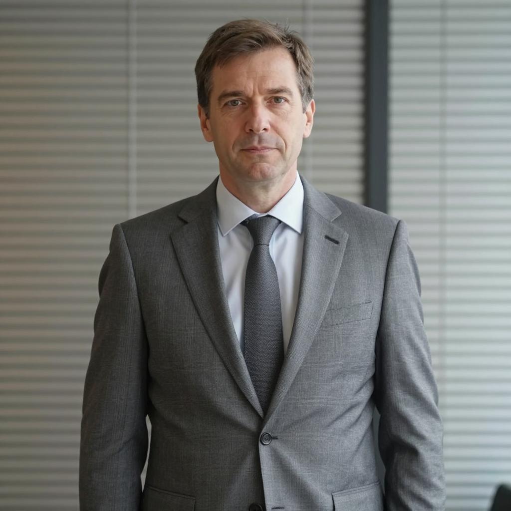 Middle-aged man with short brown hair, light skin, wearing a gray checkered suit and dark gray tie, standing in front of horizontal window blinds. Background includes blurred window blinds. Man's face shows a neutral expression. Standing upright. Indoor setting.