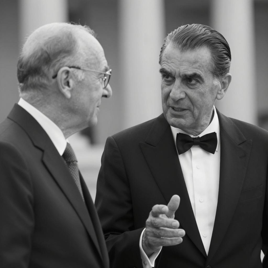 Black-and-white photograph of a middle-aged man with slicked-back hair, wearing a suit and tie, holding a coat over his shoulder. He is looking downward with a serious expression. He stands in front of a slatted, angular, modern building with illuminated lines. A tree with fern-like leaves is on the left. The man's left arm is raised, gripping the coat.