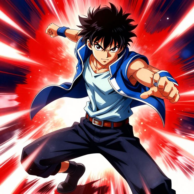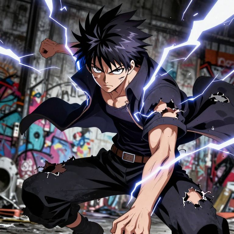 Create a anime character with wild spiky hair in mid-action pose, lightning crackling around, sharp focused eyes, torn jacket fluttering, gritty urban background with graffiti walls, intense contrast and dynamic lighting, energetic and powerful composition.