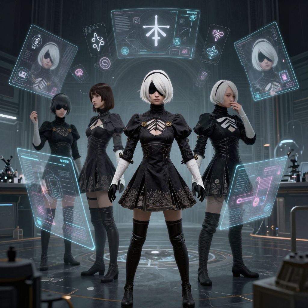 Digital art of four Nier: Automata characters in black dresses with white accents, futuristic room, holographic screens, and glowing blue interfaces.