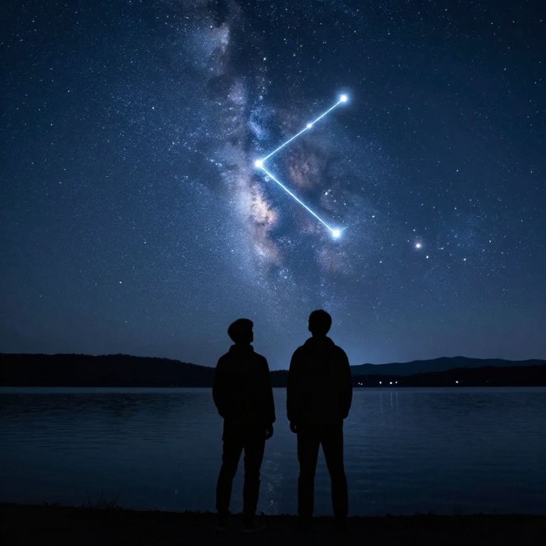 Two silhouetted figures stand by a serene lakeside, gazing upward at a luminous constellation shaped like a letter \"K,\" set against a starry night sky with the Milky Way glowing faintly above.