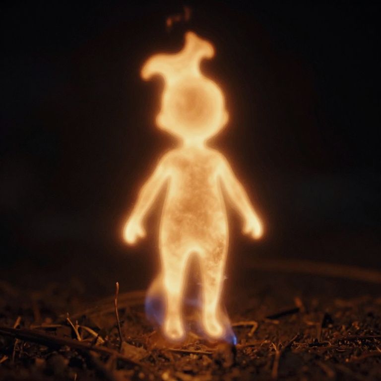 Proportion a small volatile companion fire spirit, form of a small humanoid, vague shapes, glow, no features, burning,