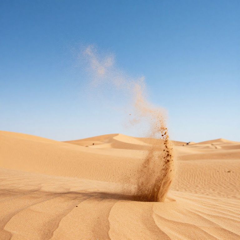 Photograph of a sand dune with a powerful sand eruption, under a clear, bright blue sky; golden sand swirls gracefully.