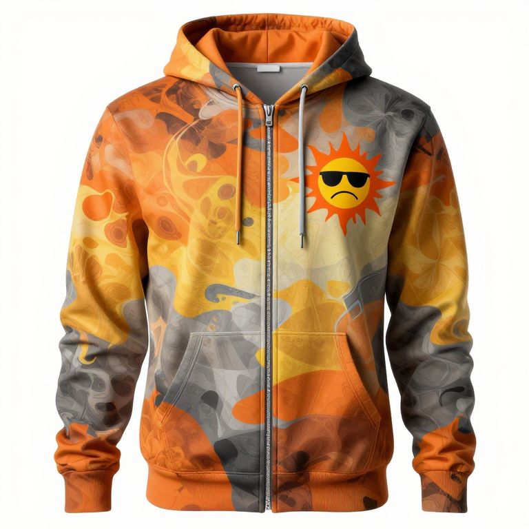 The image showcases a highly detailed and realistic hoodie with a vibrant abstract design. The hoodie features a mix of warm colors, including shades of orange, yellow, and grey, creating a dynamic and eye-catching pattern. On the left upper side, there is a vector symbol of an unhappy burning sun with sunglasses, adding a unique and playful touch to the design. The hoodie has a front zipper, side pockets, and long sleeves, all contributing to its practical and stylish appearance. The overall composition is well-balanced, with the abstract design and vector symbol creating a sense of harmony and visual interest. The high quality and ultra-realistic rendering, enhanced by the use of the Unreal Engine, make the hoodie appear almost lifelike, with intricate details and textures that are both visually appealing and highly realistic.