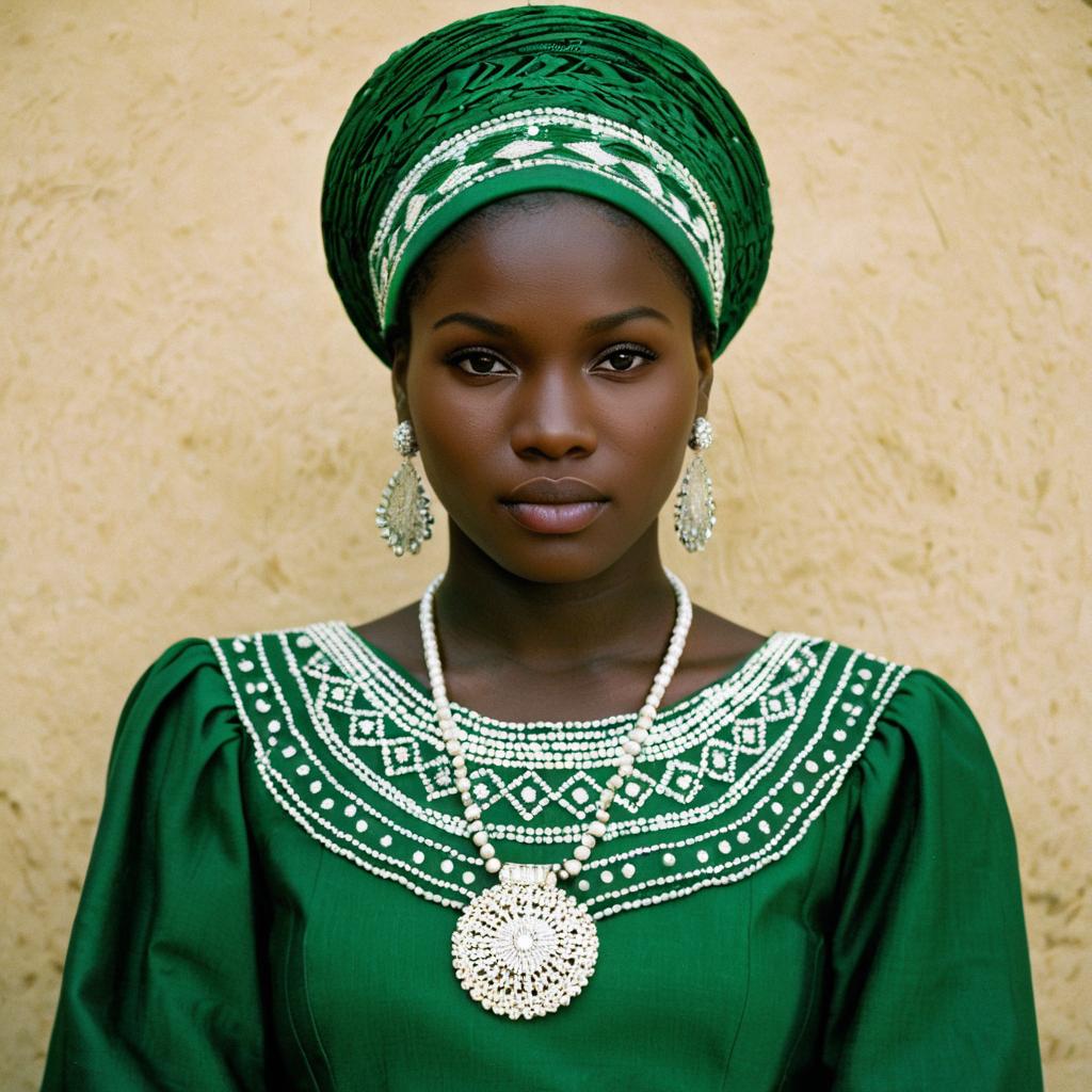 Portrait of a Nigerian woman wearing a traditional green dress with intricate white beadwork, complemented by matching green headwear. She stands against a plain textured background, wearing a pearl necklace with a large pendant and elaborate earrings. The woman has a calm expression and is looking directly at the viewer.