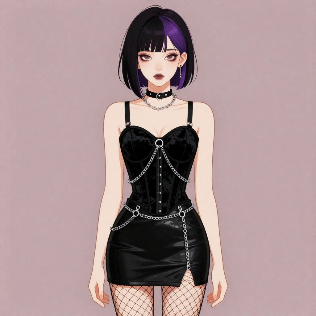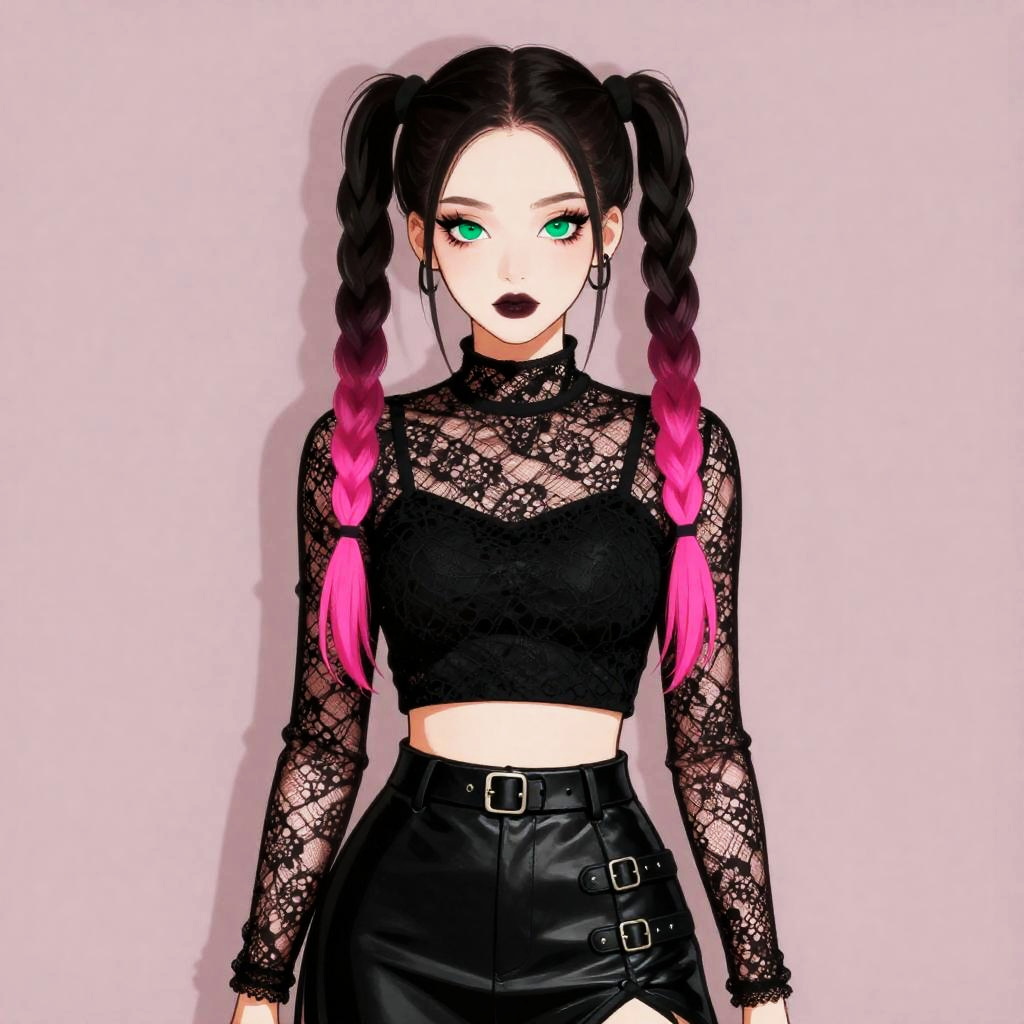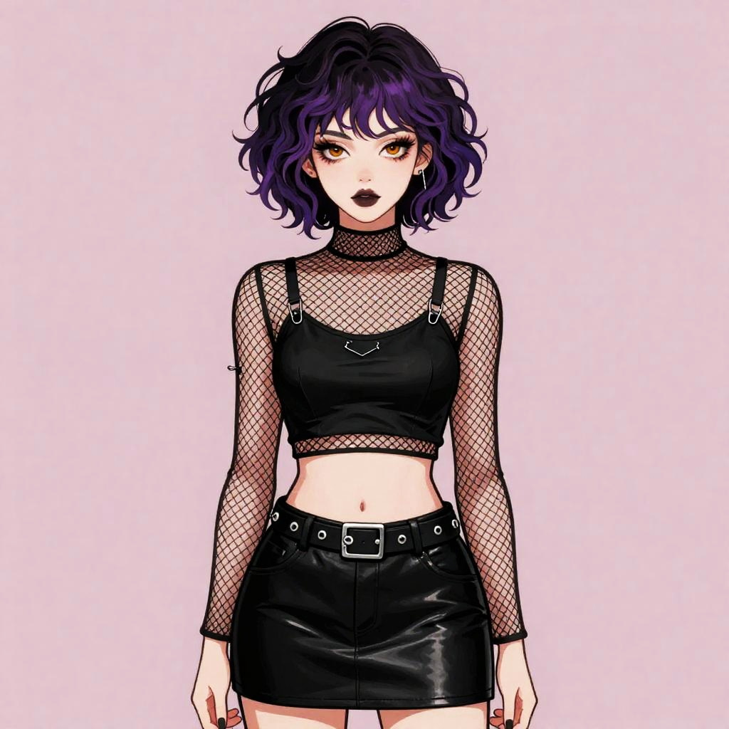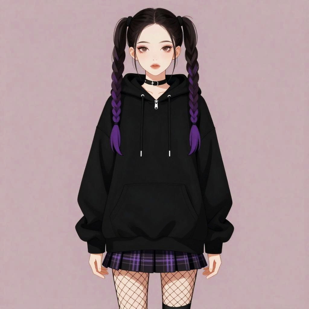A young woman with a gothic punk style, illustrated in clean anime style with flat shading. She is wearing a black oversized hoodie with silver zipper accents, paired with ripped fishnet leggings layered under a tartan mini skirt. Her hair is styled in long braided pigtails with purple streaks, with soft muted brown eyes, natural makeup, and a pale skin tone. Set against a simple muted dusty pink background, the aesthetic is modern, edgy, and slightly rebellious, with high detail on clothing textures and accessories.