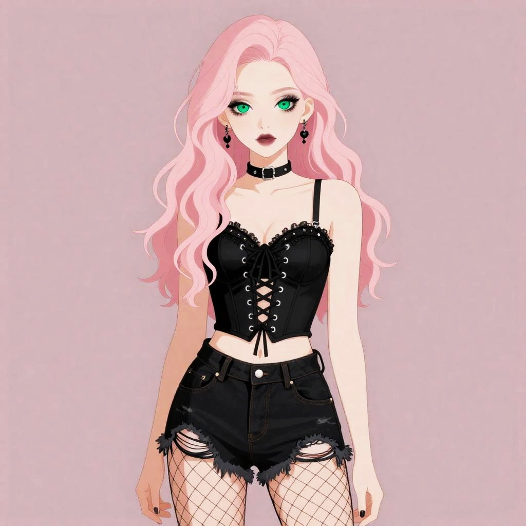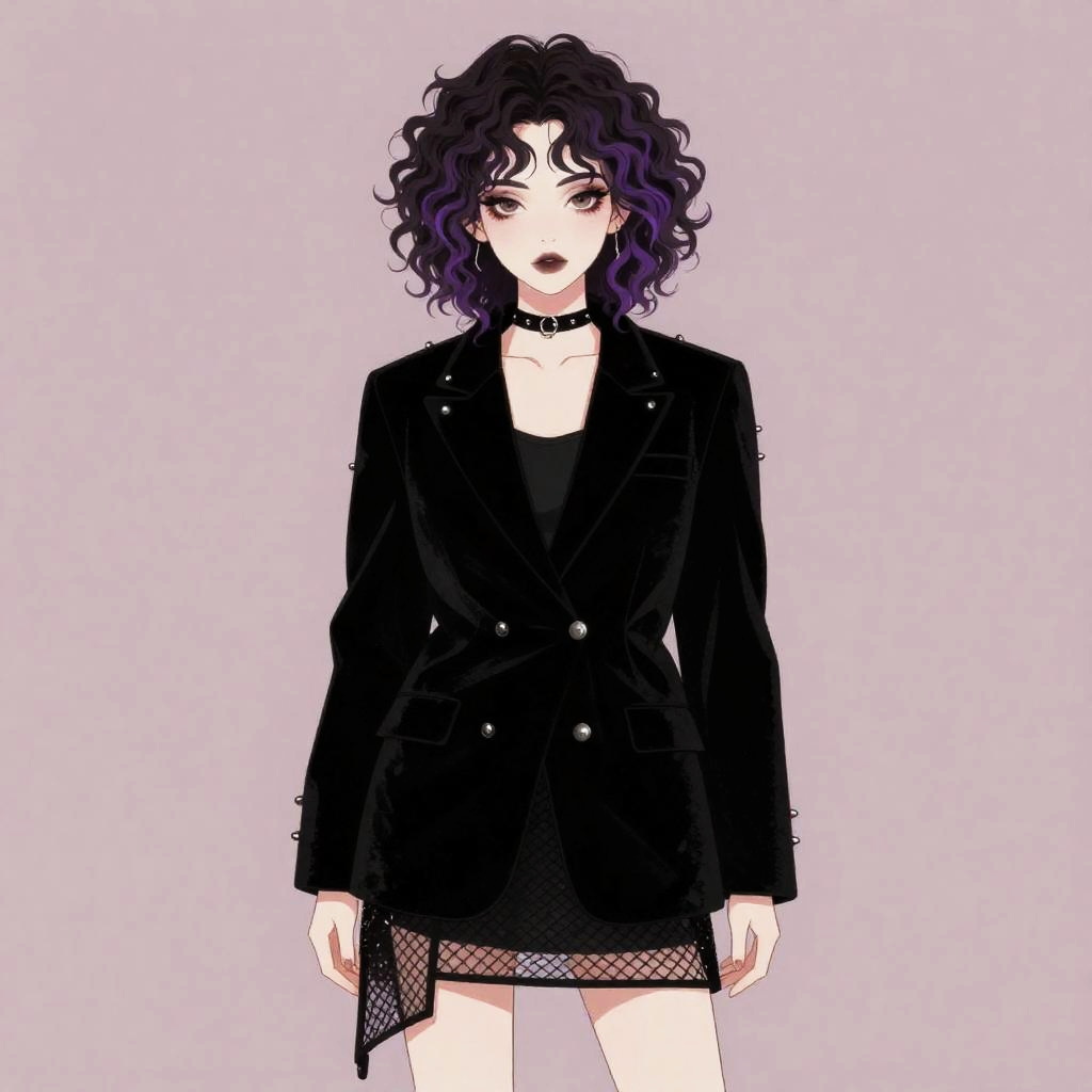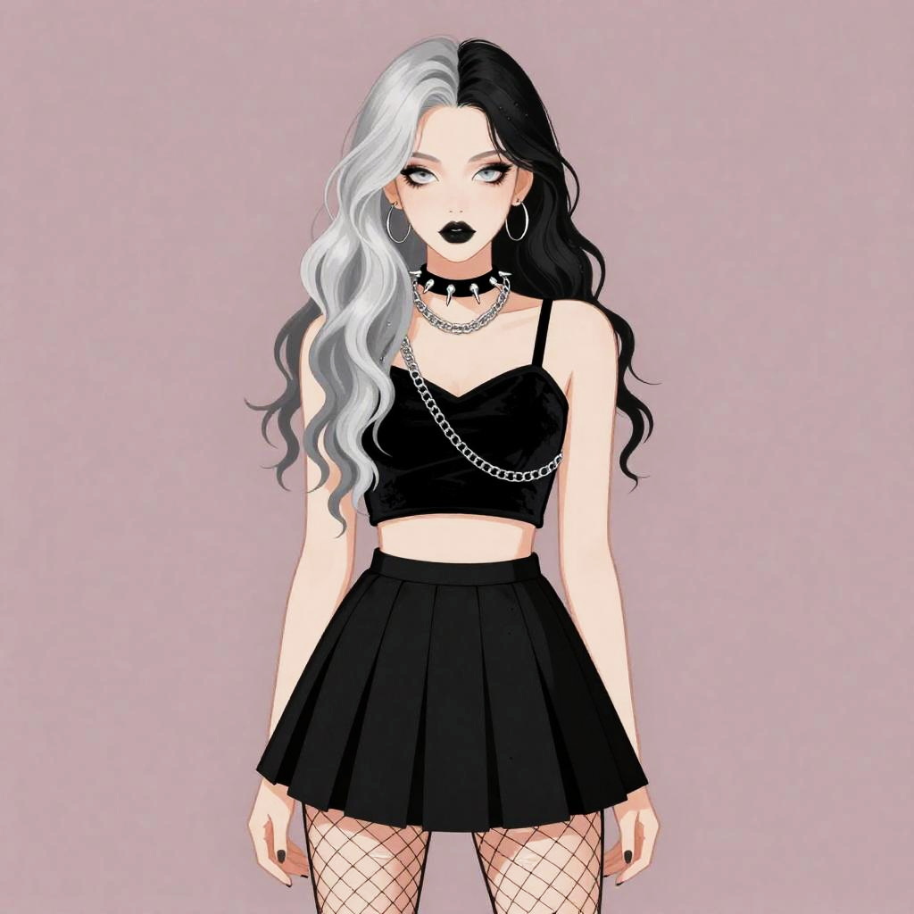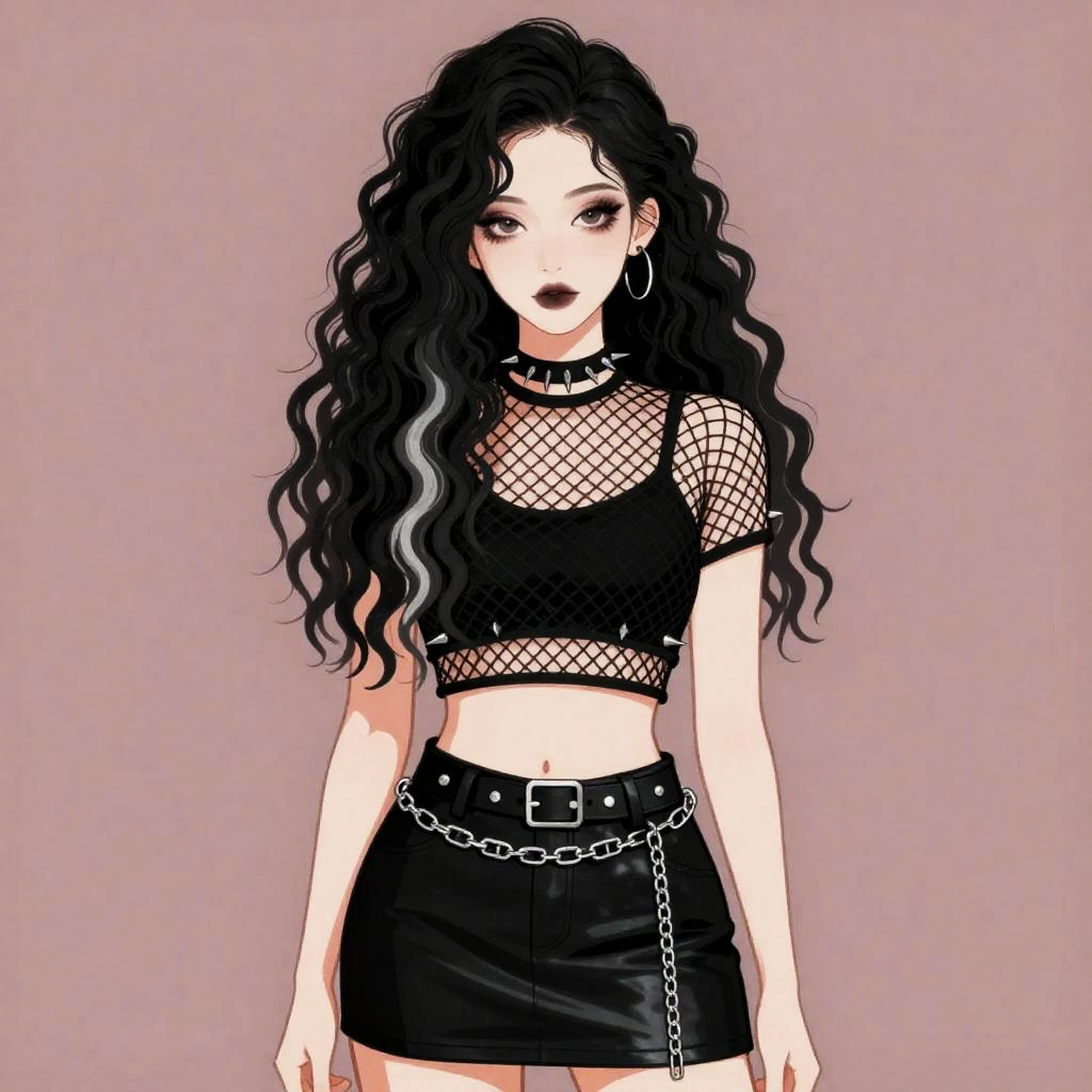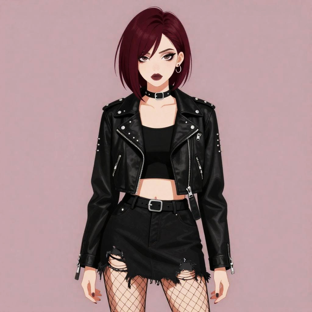 A young woman with a gothic punk style, illustrated in clean anime style with flat shading. She is wearing a black oversized hoodie with silver zipper accents, paired with ripped fishnet leggings layered under a tartan mini skirt. Her hair is styled in long braided pigtails with purple streaks, with soft muted brown eyes, natural makeup, and a pale skin tone. Set against a simple muted dusty pink background, the aesthetic is modern, edgy, and slightly rebellious, with high detail on clothing textures and accessories.