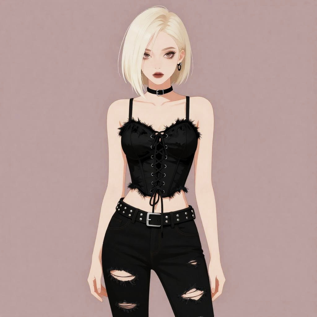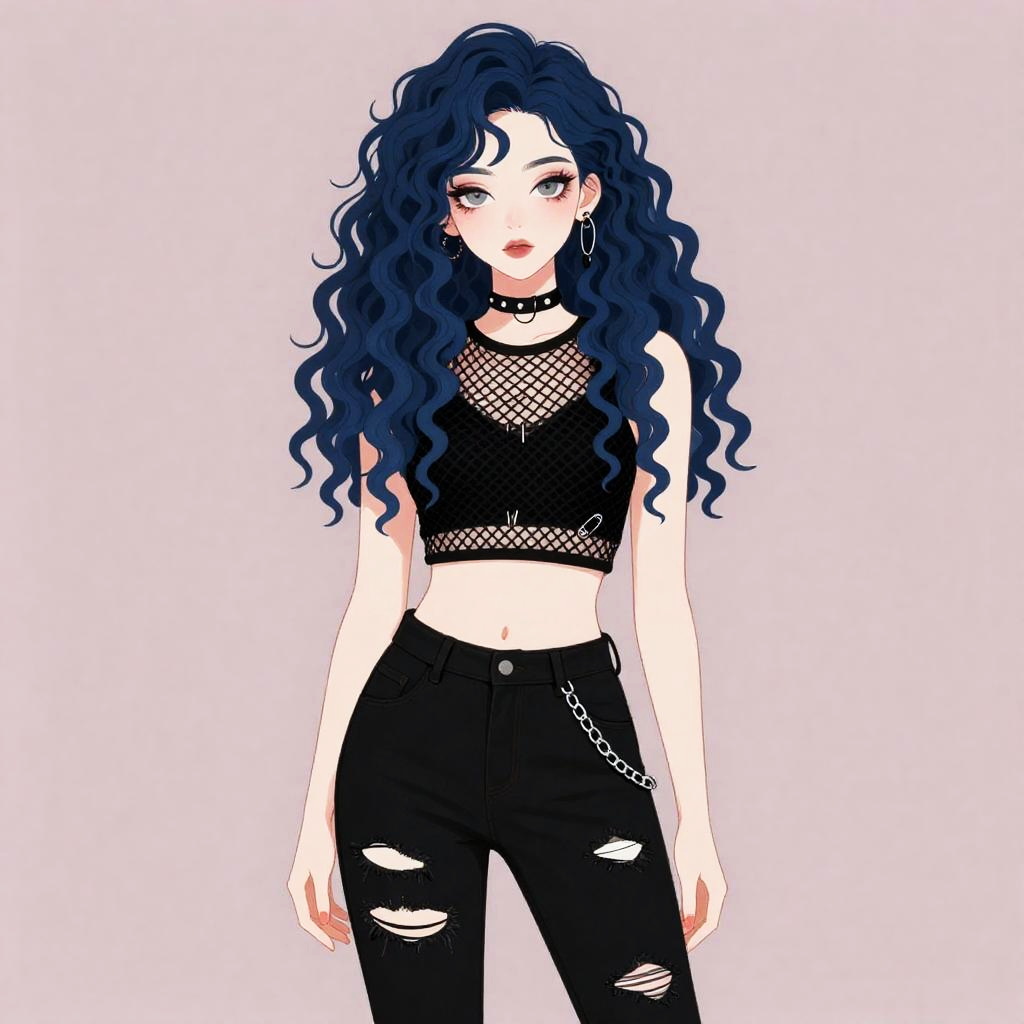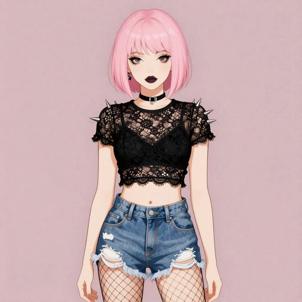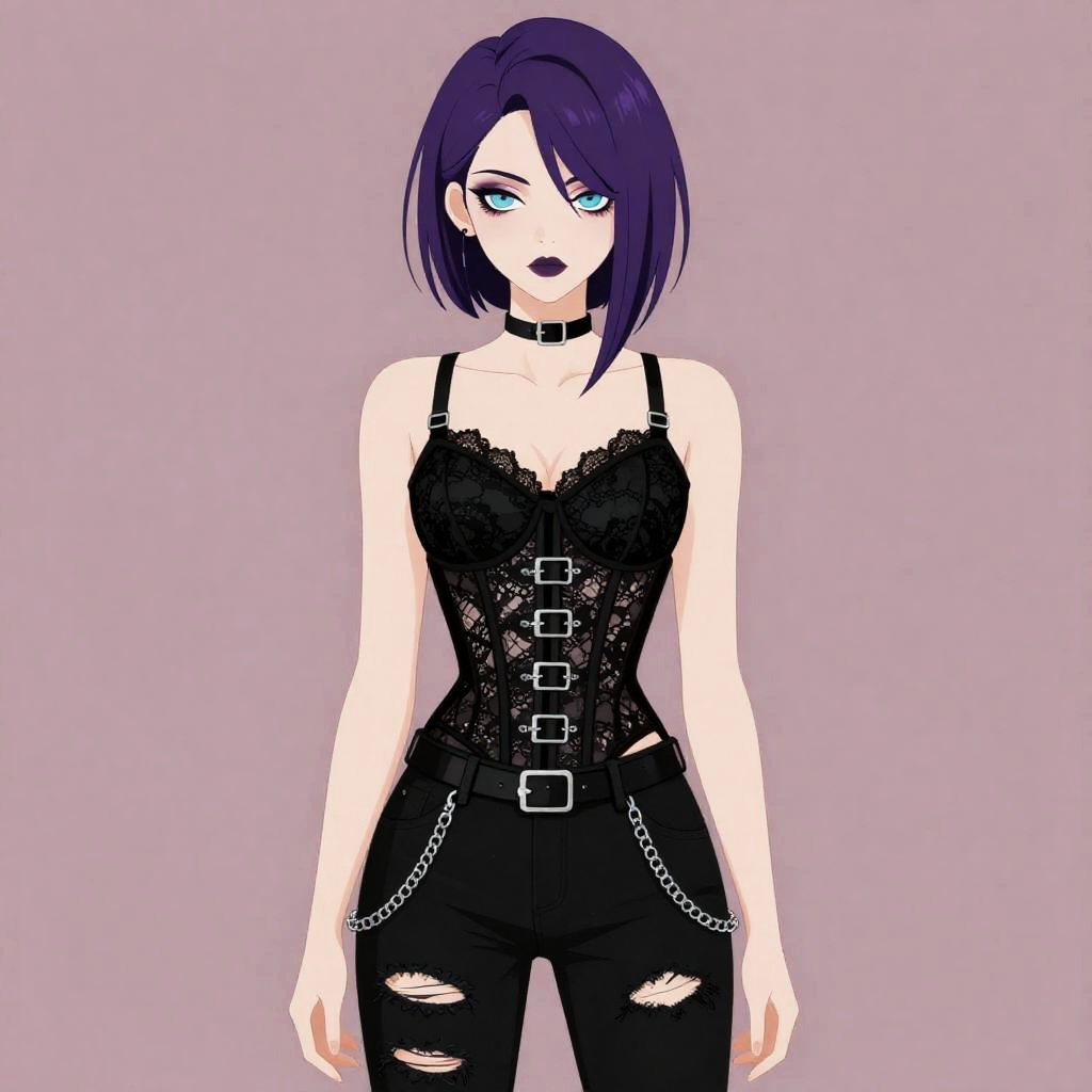 A young woman with a gothic punk style, illustrated in clean anime style with flat shading. She is wearing a black oversized hoodie with silver zipper accents, paired with ripped fishnet leggings layered under a tartan mini skirt. Her hair is styled in long braided pigtails with purple streaks, with soft muted brown eyes, natural makeup, and a pale skin tone. Set against a simple muted dusty pink background, the aesthetic is modern, edgy, and slightly rebellious, with high detail on clothing textures and accessories.