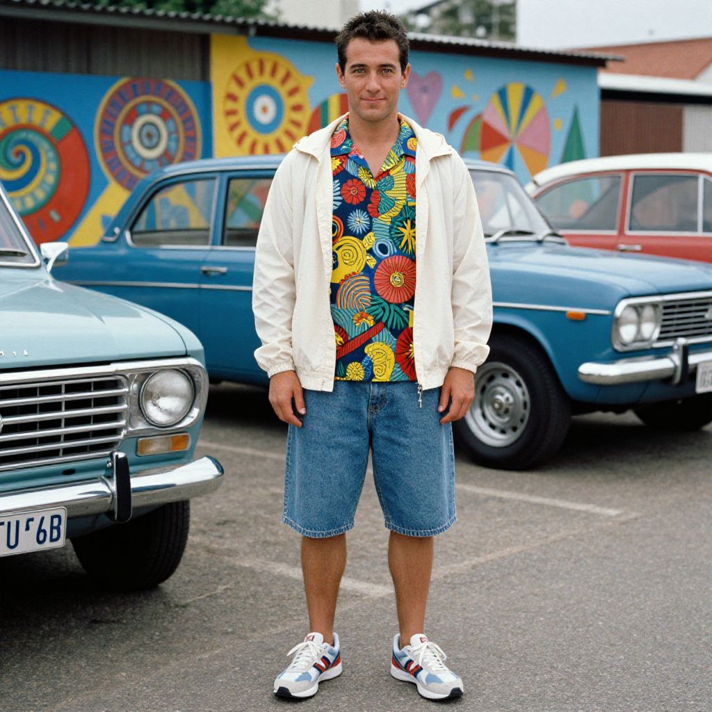A man, light blue sleeveless shirt with palm leaves, patterned orange board shorts, relaxed fit, open-air market vibe, colorful stalls, lively atmosphere, 3M ferrania analog film stock, cheerful expression, enjoying the vibrant surroundings. Man has masculine face and piercing eyes